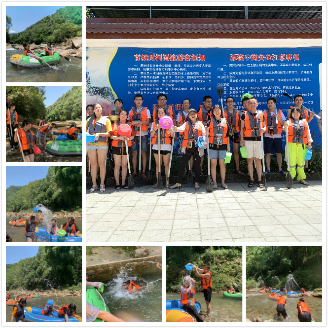 8月15日早上8:40从潮音店集合出发前往崇州街子古镇,10点到达崇州街子古镇进行自由活动。街子古镇阳光明媚,万里无云,一行人在热闹的古镇里品尝豆腐脑、拍美照、购物....... 11:50一起品尝了当地的特色美食。吃饱喝足后就进入正题了,13:00出发去青城两河漂流,一番全副武装后,就开始了我们的漂流之行。一路欢声笑语、言笑晏晏,穿过丛林,越过河谷,看着清澈河流中的小鱼,感受吹来的一阵阵微风。不知谁开始的泼水大赛,每个人都加入了其中,一场场激励的混战和一次次的团结对外,让大家更加的团结友爱。